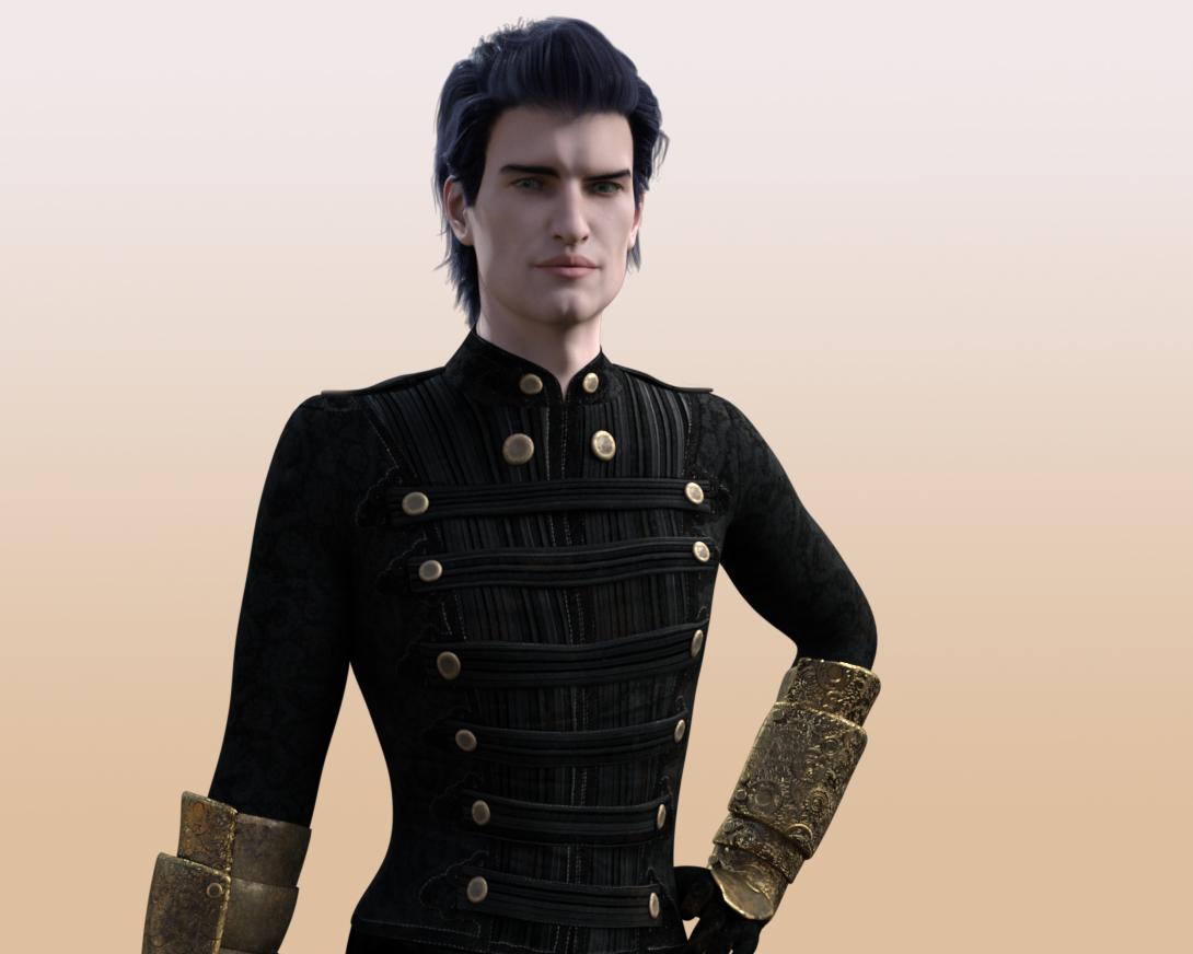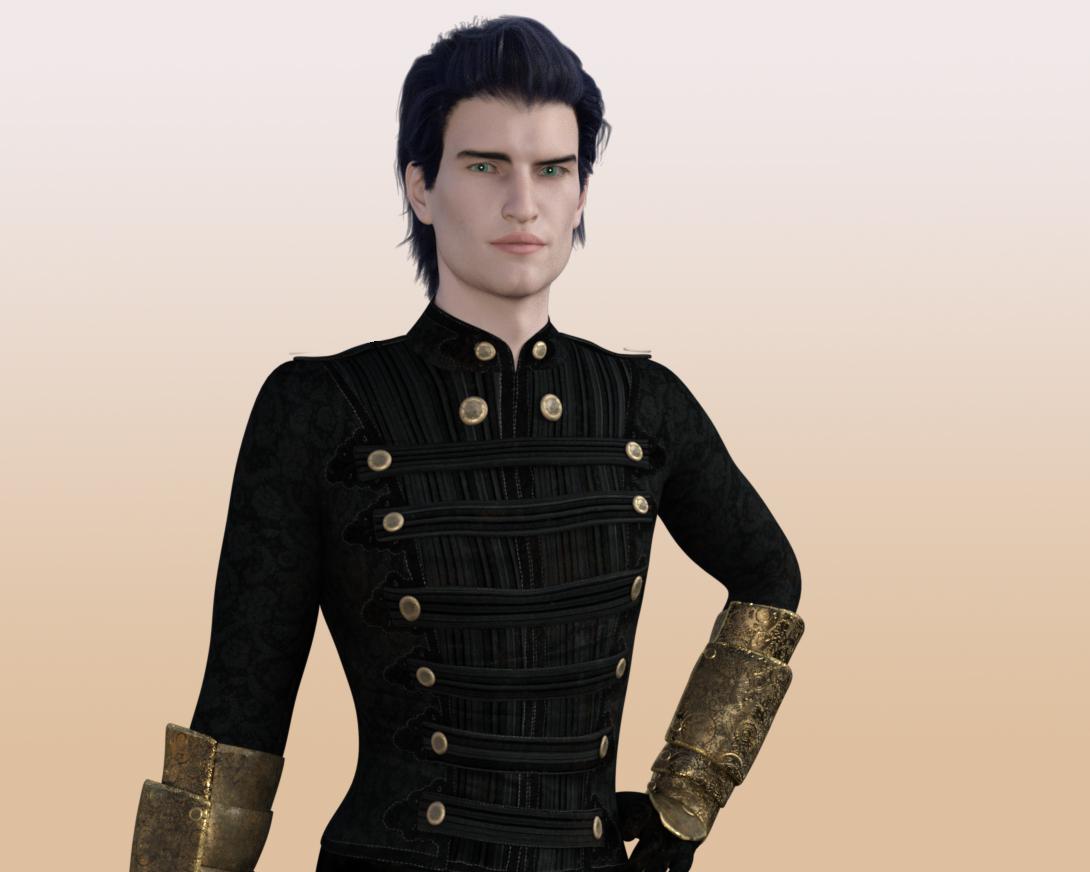 This is Vincent. He has three skin translucency options and I picked the middle one. He comes with facial hair options, which I haven't used here. I did find his lips were too pale (as it should be for a vampy type character) so I tweaked the color just a little bit. The first render is without any lights. I really like how his eyes sparkle. The second is using OOT Male Iray Lights, which I think put some interesting shadows on his face and gave him a bit of mystery. His eyes aren't as sparkly because of the shadows from using the light set, but a spotlight or post work will easily bring them out. He's wearing the Time Soldier Outfit. The outfit comes with some gold upper arm armor to match the gold gloves. I took the armor off. I was unable to take the gloves off - when I did, his hands disappeared as well (I don't know why). Same thing happened when I only cut out the opacity of the gloves. I'm sure I will figure it out. I also took off some gold trimming from the shoulder areas. If you want to see the orig outfit, I'm doing some tests of the Look At Me Pose Controls product on my own thread. Since I'm using the same character/clothes, I didn't want to spam this thread. The hair is Axel.
