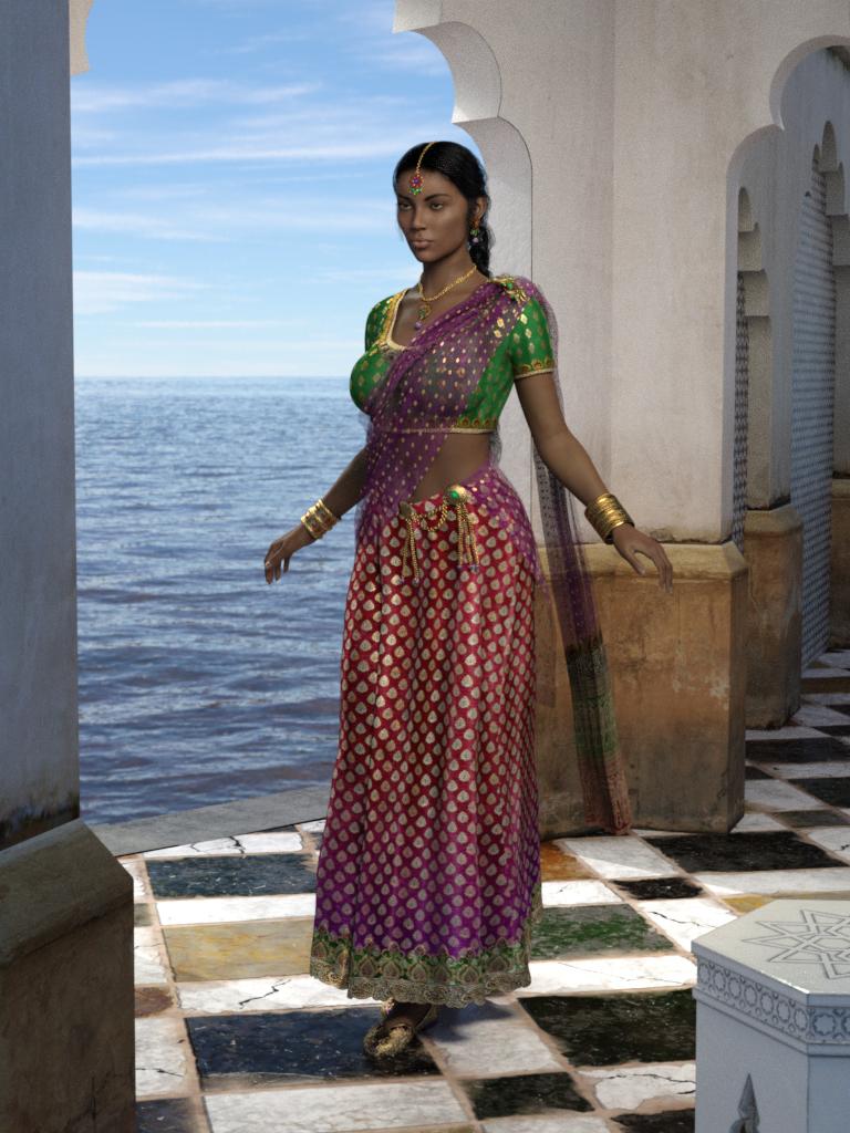 This is the Saree outfit with one of Moyra's pretty Madhubala textures. For the wearer I thought I'd try using Laverne from the Monique 8 bundle because her skin is quite light - I also like the fact there are some subtle makeup options like this eye-liner only setting. Actually I modified the character a little to fit better with my Indian outift (reduced the dials and used a few morphs on the mouth). I found a problem with the Saree set in that the whole outfit load names the wrong .dsf from the data folder for thenecklace, so it loads as the dreaded grey blocks. The individual accessory load for the necklace is correct though. There are lots of morphs on the various pieces to drape and move them around. I plan to try dForce draping at some stage, but I have not tried it yet so I can't say whether it will work on this set.