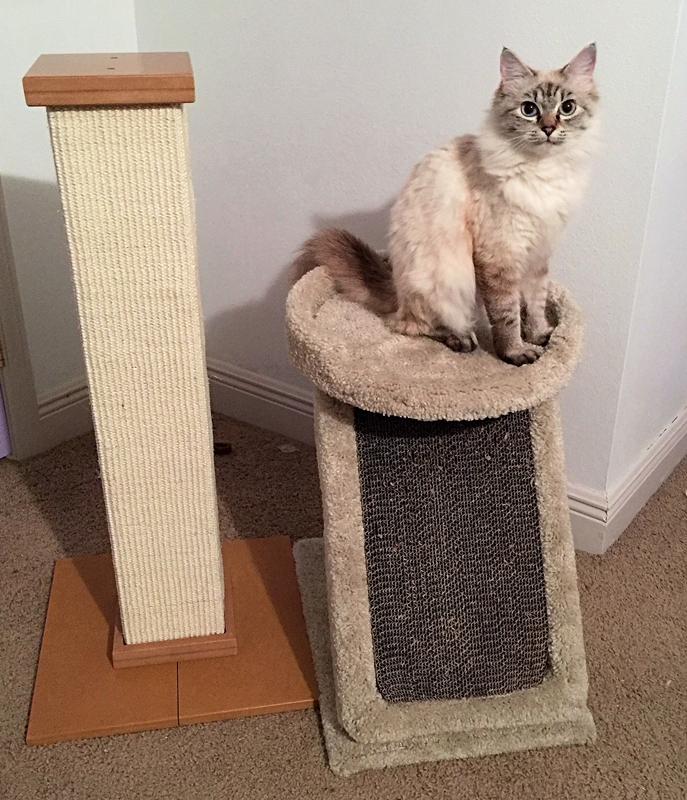 Progress report on Lily. Happy Camper.  I first got her the cardboard/pet bed scratcher, delighted that I found a kitty condo piece that was mostly focused on the scratching part. I ordered the tall post and waited for it to come in, it's sisal. She loves both of them.