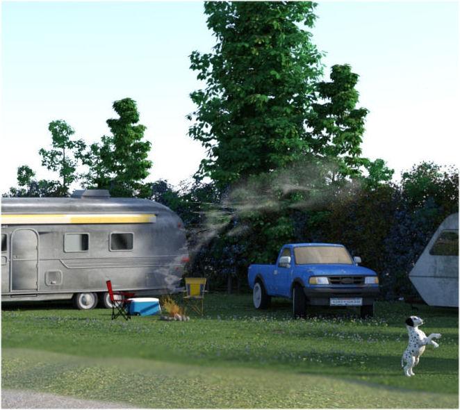 I always get too excited and publish my images before I'm completely done with them. Yesterday I missed a webinar on ParticleShop for Paint Shop Pro. I followed up watching the YouTube video today, and that got me excited about brushes in PSP. So I went back and did some postwork on the fire and the grassline between Tangy Orchard and the Pond Builder kit. I'm not going to bore you with the whole thing again, but here is the part where I concentrated most of my efforts. I'm really hapy with the smoke effect. I have Sy's smoke layers and some fire effects, so I could have probably just rendered it instead of doing post work - but I really like the way the post work ended up - the smoke really seems like it is catching the setting rays of the sun over the edge of the trees.