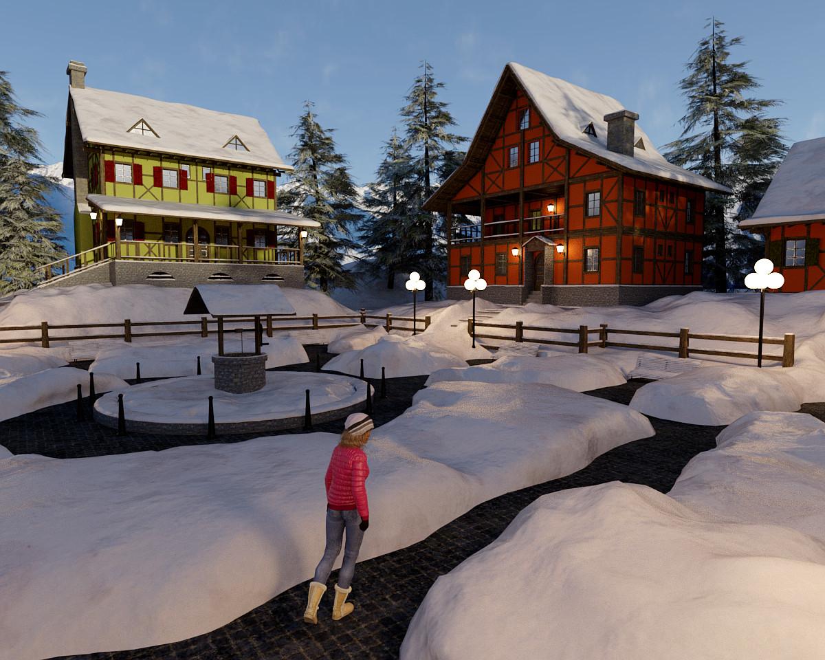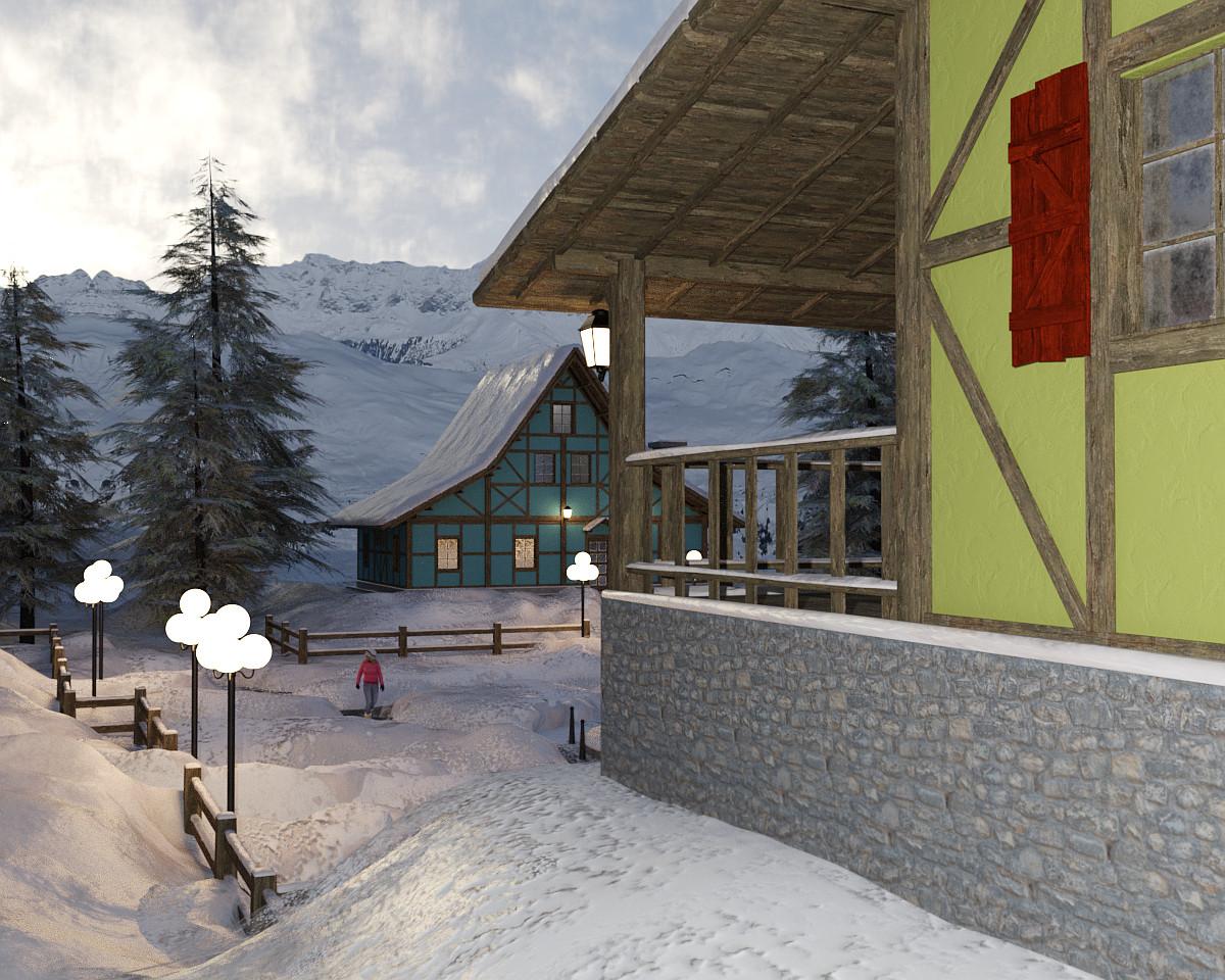 I've decided this year I need to render stuff I buy and not just stockpile it. I picked up Northern Winter Village yesterday. I like what I'm seeing. It comes with a 3DL or Iray scene with five buildings and a mountain surround. The village has pine trees, steps, a central square, street lamps, and paths through snow mounds. It reminds me of some of the skiing villages I've been at.  It renders with a light that's similar to late afternoon at northern latitudes - the sky is still blue but the lights have come on and are casting a glow on the snow. There is no sky with the set, so I used one from Eternal White Skydome and HDRI which is a fitting companion.