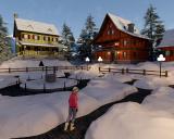 I had the same reaction to the smooth edges of the pathways and thought of modifying them, but then I wanted to show what you got out of the box. You see the same flawless edges next to the buildings. I added a push modifier to the ground and made some variation along the foundation. I also used the DA Let It Snow shell and medium snow 1 shader. The geo shell shader makes for an older snow look than the original. Here's a render with the push modifier in use: