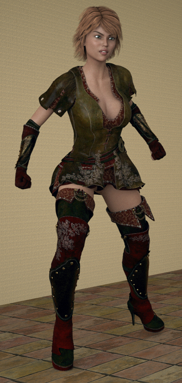 My outfit seems a bit more fluid in the skirt than the promos,and the neckline seems a lot lower. This was the default as it loaded. It comes with a bow and arrow, and a hat, but this will give you a feel for the product.