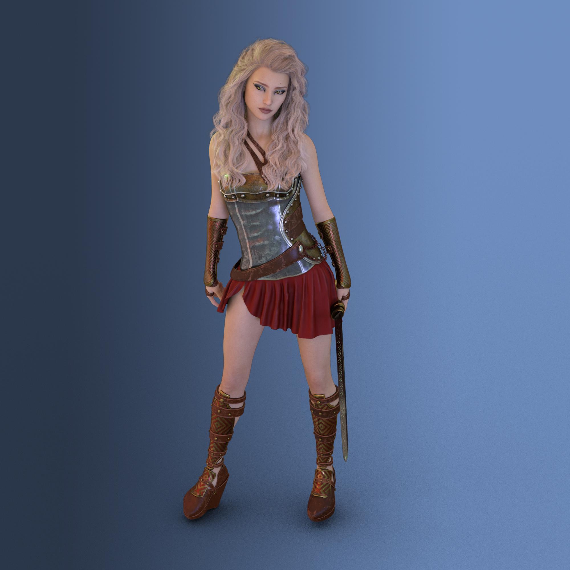 Here is Anastasia . She has a delicate, ethereal appearance, making her perfect as an angel or fairy. I wish I'd put wings on her! She has a range of make ups from plain to exotic. I decided to go for a bit of exotic around the eyes/eyeliner. I've used Whitney hair which has a nice color range. She's wearing Godess Minerva outfit which I like a lot. It seems to work well even in extreme poses. The only thing I don't like about it is the shoe part of the boots. To me, they look clunky/heavy in comparison to the strappiness of the boot. I also used Illumination Iray Lights which I love for its ease of use.