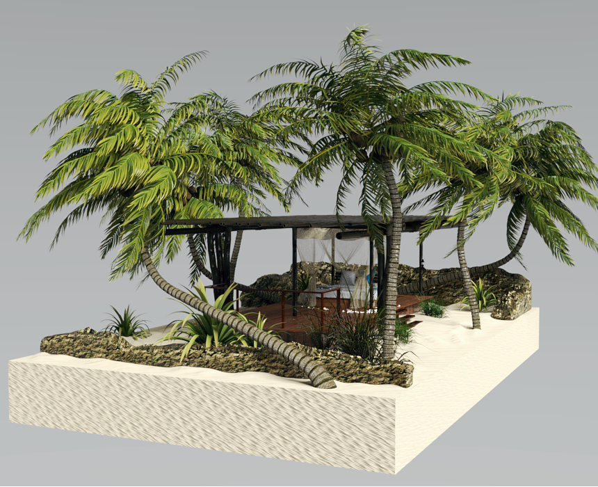 Not a fan of that almost-laying-down palm tree, found it a bit much for my personal tastes. Palms do curve toward the light if deprived of the sunlight due to shade. Some species probably also curve on their own regardless. I just prefer less slope.