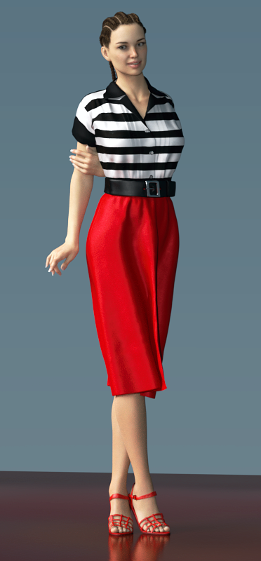 This outfit is a LOT of fun, you can mix and match the colors / stripes and belt. For the shoes, there aren't any red, so pick the white/silver and use the Surface to change the base color. Shown here is  178 / 30 / 0 which I think is a good match.
