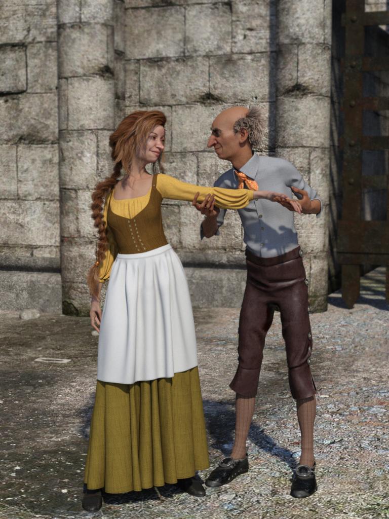 Here are Edie and Ollie together. She's wearing the dForce Peasant Dress and Perrin hair, he's wearing House Brownie (with a little retexturing) and Georgie hair and brows. The background is the Back Gate, which I thought was a suitable backdrop for a bit of olde-worlde courtesy, where Ollie is quite taken with the newcomer.