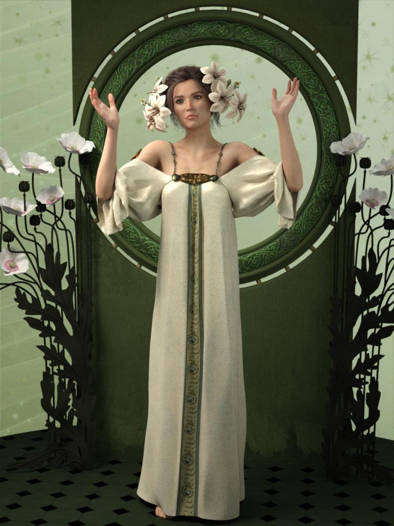 Finally I wanted to show the Muse dress. I used to love the Genesis version which Mada made, but had a little difficulty dForce-ing it when I tried. So I was really pleased to get this version for G8F. I didn't buy the extra textures, so this is out-ot-the-box. This is a fairly easy pose, so I can't say (yet) how well it will work in more complex poses. I didn't choose Edie for this one, but used LY Sorrell instead because she is the most "art nouveau" of the G8F's I own so far (I really must try converting Aibell to G8F.....) The background prop is from the original Essence set - I simply removed displacement, increased bump and put the Iray base shader on everything.
