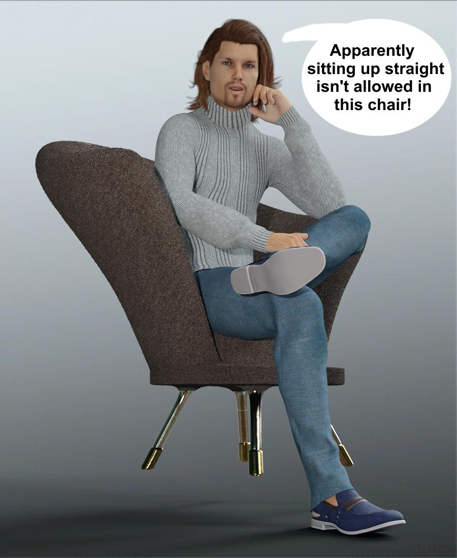 So you can see this out of the box. Be aware the 50's Fabulous Morphing Chair  wasn't quite so fabulous out of the box with a man. To get his feet on the floor for a regular sitting pose, the chair would have to be raised. Some scaling here and there will address it, or extending the legs of the character so they're more in front of them. I'm checking now to see if there were chair legs morphs, back in a few.