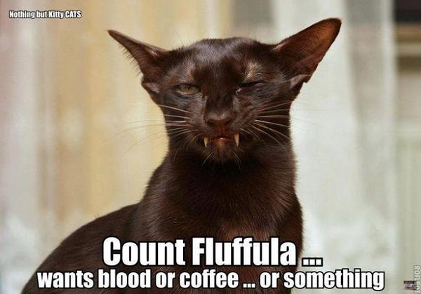 Probably she wants cat chow or canned cat food or something like that. Did you know cats already have fangs?Is just a cool picture if you ask me. Looks so Vampire like. In my 52 years of life, most of which I've had at least one cat, once I had 37, I've never once noticed they had fangs. I've seen their upper and lower canine teeth but no fangs.