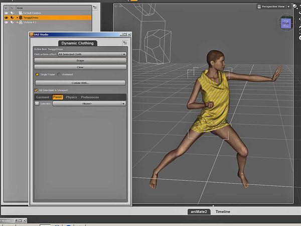 Animated drapes are the way to go. My problem, however, is that the collision detection in the dynamic clothing control is pants. Even with animated drapes, clothing often falls right through figures because collision detection is having problems. Very frustrating when you have to keep adding "low rez" primitive shapes (I usually use cylinders) to the figure to act as 'drape guards' because the clothing isn't colliding with the figure. And yes, all the appropriate stuff is listed in the 'collide with' options. It seems mesh density plays a large factor in it. Too fine a mesh and the dynamics just don't collide with it.