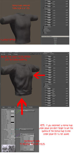 One on poser showing the difference using no normal maps and the flattest shape, and a normal map with "strong" folds morphs...