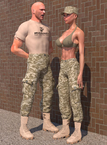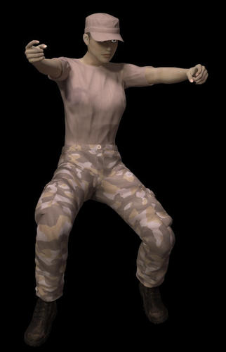 Concerning Iraqi textures, I deliberately decided not to develop them, because I had already many many textures and that the ds3d product already had them... But if you want to know, I have plenty of "digital pixeled" seamless camos in my filter forge library... The boots are also uv mapped so that you can add easily any seamless "white" fabric pattern on the front/back and side faces.
