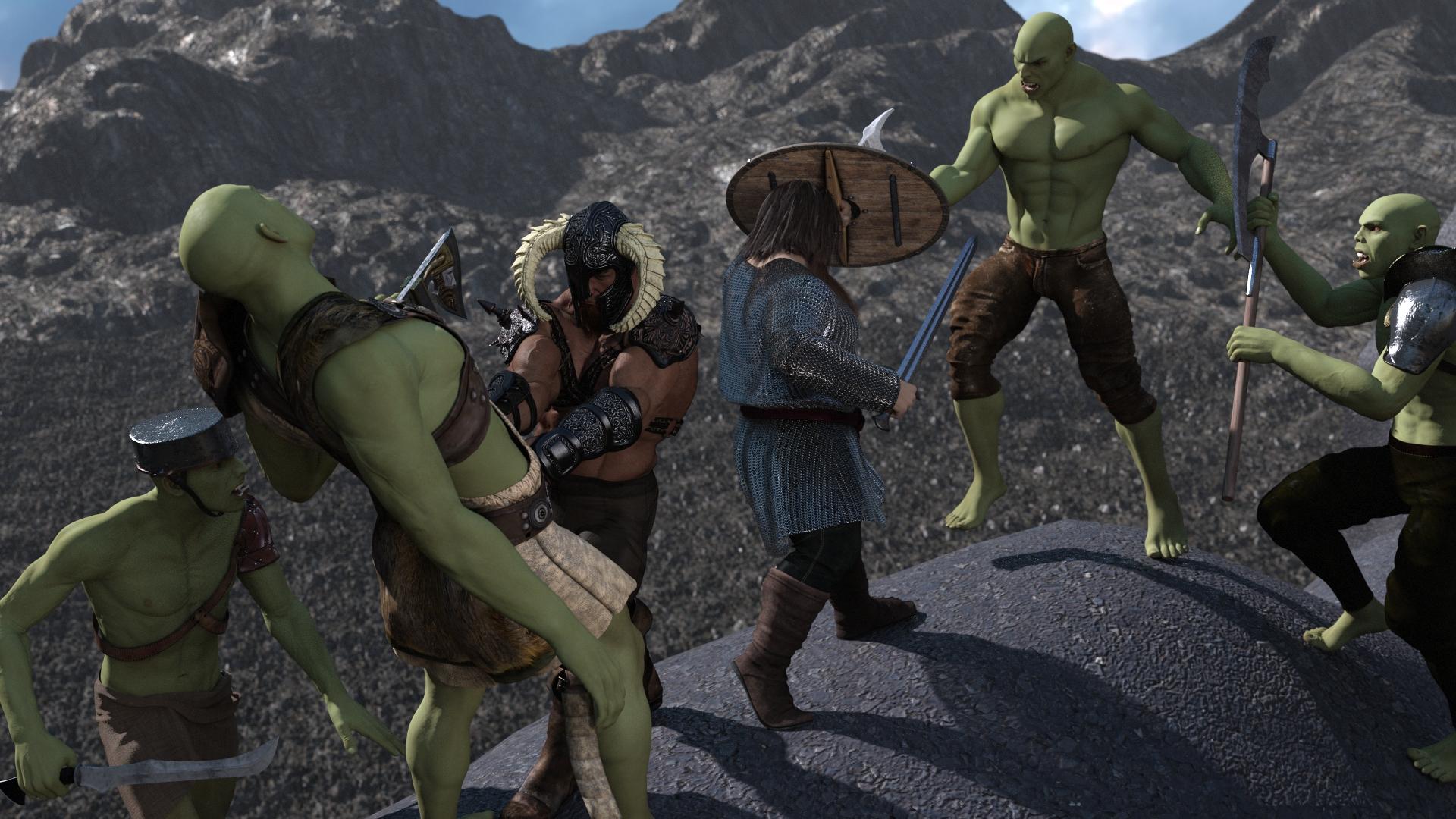 You have done a very nice job on the posing. Getting interacting characters posed isn't easy. I did notice, however, that the right toes of your guy in blue with the shield is in the rock. It looks like you need to put some more bend in his toes and possibly a bit more bend in this shin.