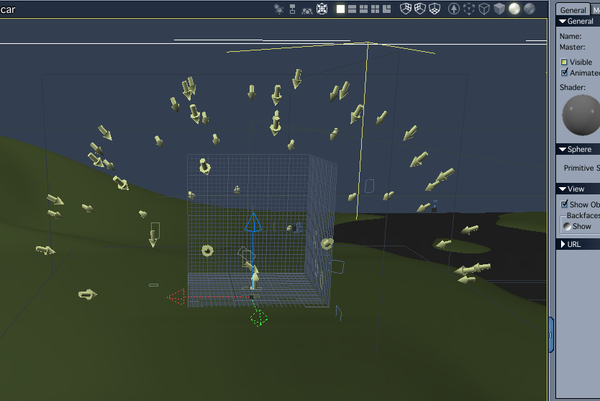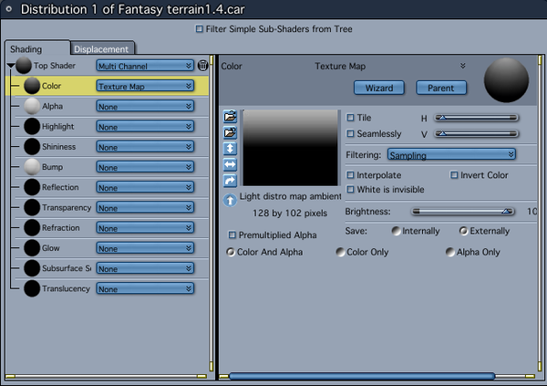 To control the placement of the lights I created a distribution shader with a black and white color gradient. The white would be where the lights are placed and the black would have no lights. The graduation between the two would have fewer lights. I could probably have just created a vertex half sphere, but I already had the gradient shader so I just did it this for expediency. I hid the sphere by un-checking it's visibility, thus leaving only the replicated lights "visible."