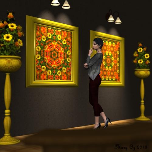 USED: Bell Flower Garden, Victoria 5 (with AG-Top/Koala Necklace/Earrings, 50s Pants/shoes, Orion Hair), my own gallery walls/floor, AC_RMFrameMirror (with my own Kalidescope Textures of the Bell Flower Garden), Days of Cider Bench, CDS Plant Stands, FCC_W_Lights (on the wall)