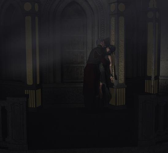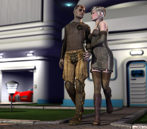 Thanx Totte and Scott for the advice and encouragement. Here is a second render. I added a distant light to give the area a little more illumination and I added a spotlight directed mainly on the face of the female character. I also added raytraced shadows to give more depth to the scene and adjusted the render settings a little bit.:coolsmile: