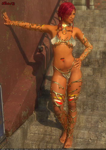 This one kicked my butt numerous times but I percevered with it, the skin is glossy translucent with volume to simulate sub surface scattering but I think some of the detail is lost unfortunately, the hair is glossy translucent purple with a very low bright red absorption. The Classic fantasy bikini was supposed to be gold but it came out super reflective which actually looks pretty good I think, narrow angle depth of field and a little bloom for good measure.