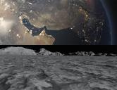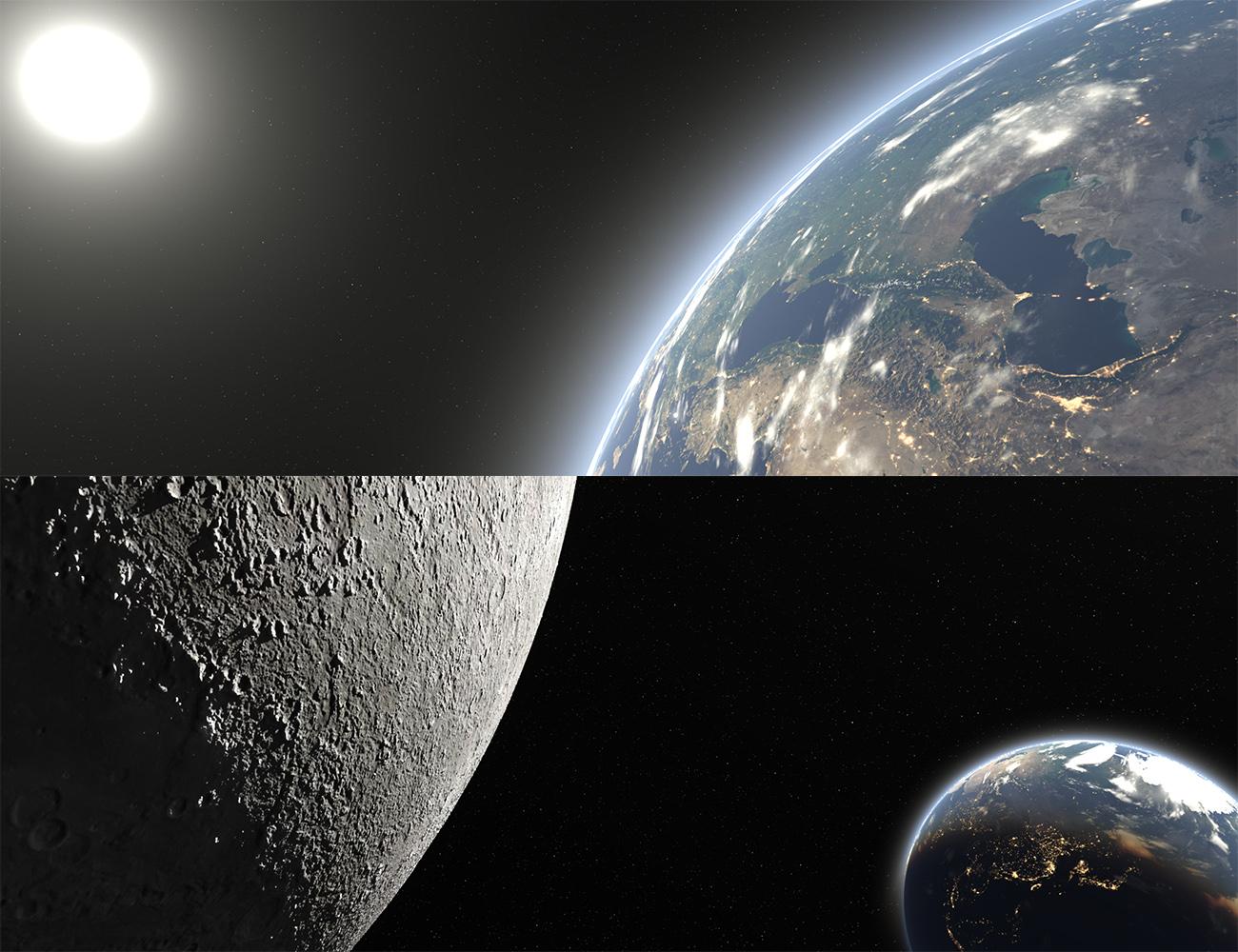 About 8:40 into the video I show the earth and moon in orbit remember these are images mapped on an infinite sphere and it lights the scene with that image. So there is no physical geometry it's all been pre-rendered for you !
