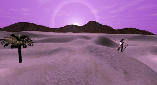 The desert scene is based on David's desert tutorial but I messed with the lighting and added a couple of Bryce objects: Lisa's palm tree and old man Rex. I generated a Bryce palm tree first but did not consider the results very palm-like.
