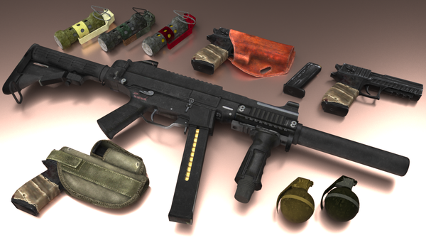 I did this first render so I could show the great detail of the HK UMP45. After working on it for a while I ended up backing the camera out and kind of missed the whole point of the picture in the first place. Oh well... The second render shows the UMP45 and some other weapons up close.