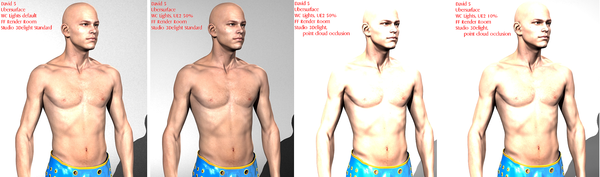 Here's what I mean. On the left is David 5, in the FleshForge Render Room from ShareCG. Uses Wancow's light setup at full strength. D5's default texture uses Ubersurface -- not HSS and not US2, just plain Ubersurface, and his settings are whatever the defaults were.