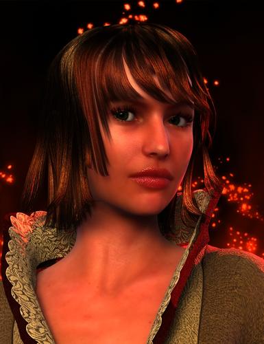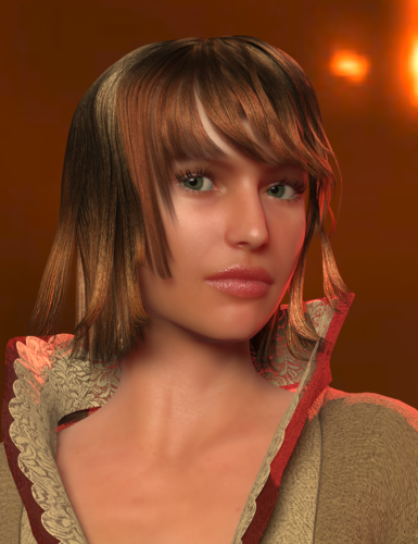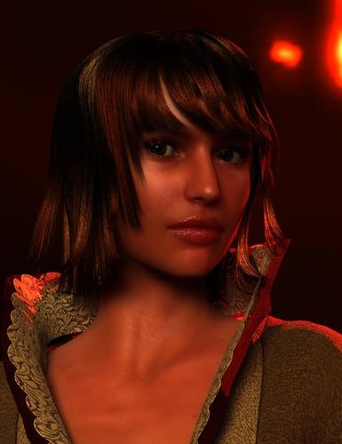I'm also attaching my take on the "Fiery Genesis" scene. It uses a sphere primitive to help with GI bounce (this is why the background looks different - and the camera finally has something to really DOF against, heh), raytraced shadows on lights (I put dzLights in and changed them around), full throttle SSS on skin (the lip shine is not the best, but I got bored, sorry), etc. All the materials are plain UberSurface. The hair is excluded from GI, but the transmapped collar is not. It's one of the slowest parts of the render. Anyway, it's 23 minutes on a quad core, what with five diffuse bounces, soft raytraced shadows through transparency, SSS, that collar, etc. I could share the file, if anyone wants. Don't try it with the REYES hider, though =)