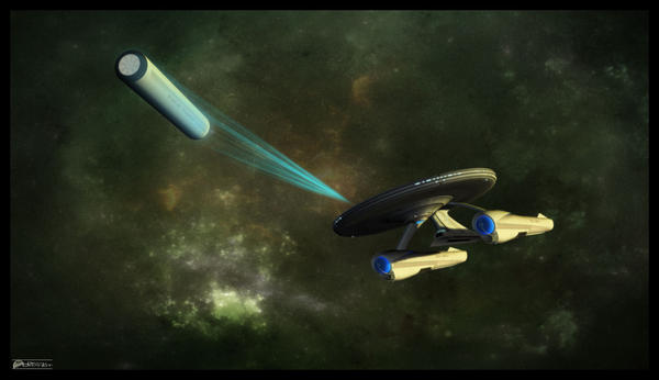 the tractor beam was created in Photoshop using god ray(light beams) brushes on a seperate layer as well as a seperate layer with the glow on the container