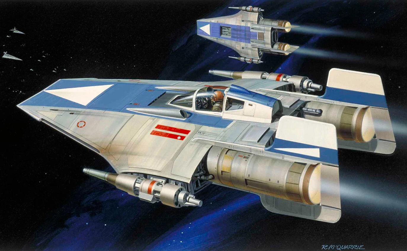 And yeah, I was definitely going for an old school original trilogy feel with the design of this ship, with this intended to be an additional new fighter design to bolster Rebel Alliance space forces after the Battle of Endor, salvaging old X-Wing parts, developed by perhaps the same design team behind the highly successful A-Wing starfighter, only this ship would instead of being built for raw speed, be designed to be highly maneuverable and have serious stopping power in the weapons department, making it a good compliment the fighters already in their arsenal, In fact the paint scheme was actually inspired by an early Ralph McQuarrie A-Wing concept (now seeing service in the Star Wars Rebels animated TV show), and I used it to pay homage and give some clues to its possible lineage. See the art below for reference.