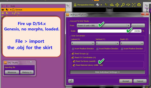 One imports the .obj file in such a fashion for it to land on Genesis at the correct size/placement. Transfer the bones over. Save the file. Done. Make mats, morphs, etc as desired.