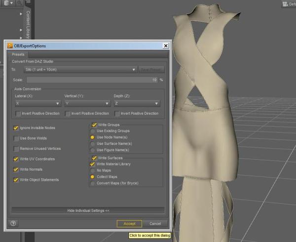 Below: Dress made in Hexagon, then imported using the Silo Scale (no bridge for this, just imported the obj file :) )