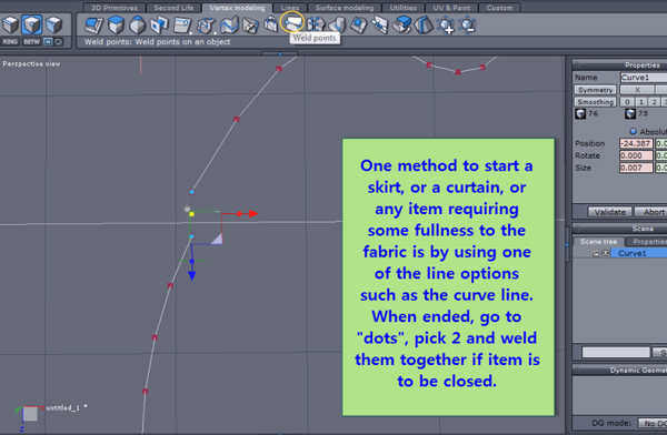 5. Import in the aforementioned Genesis with Dress object. Can weld it all together [helps Hexagon manage] - can also select all the faces/make a 'new' shading domain and colour it red or something ... and then resize it down to the bridged in clothing item.