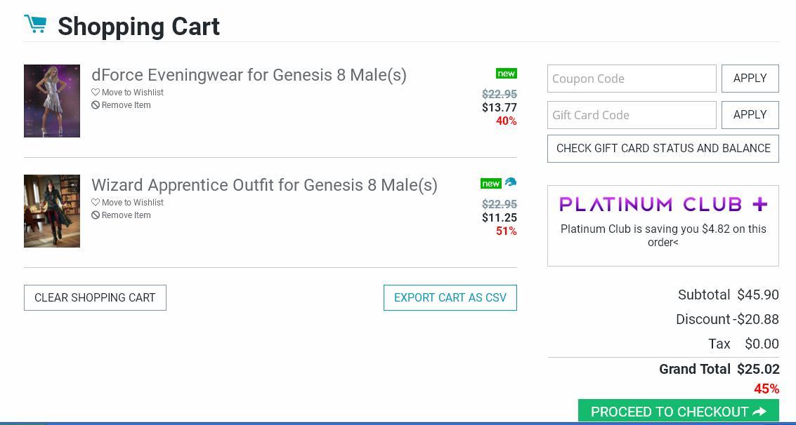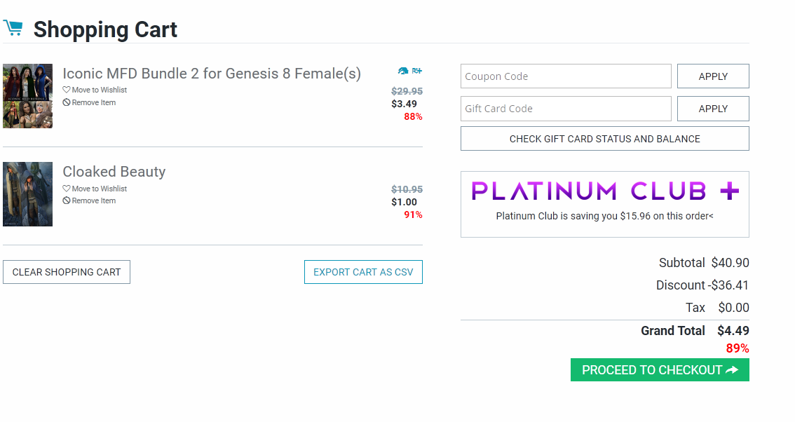 Well, I have to say, I'm underwhelmed with this sale. Not with the products, just the sale itself. 55% off straight through, no stacking, this weekend's catch-up sale doesn't even have the $20 off all Daz Originals like it did before, and I already own all the old free stuff I want. I'm sure I'll see the items now sitting in my cart as part of a flash sale for 60% off or in Fast Grab and it might be within 30 days and then I have to write a ticket which is a pain, or it will happen right after 30 days and I'll be kicking myself...