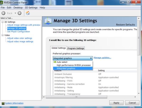 Re: NVidia bug: I don't have integrated graphics on my machine, so I don't have the option to choose between one or the other. Not even a dropdown box. :P I've decided to do a manual uninstall and reinstall of Daz Studio in the hopes that that'll fix everything.