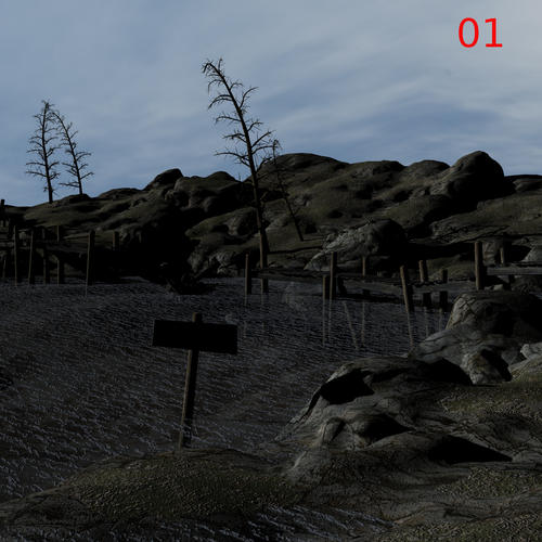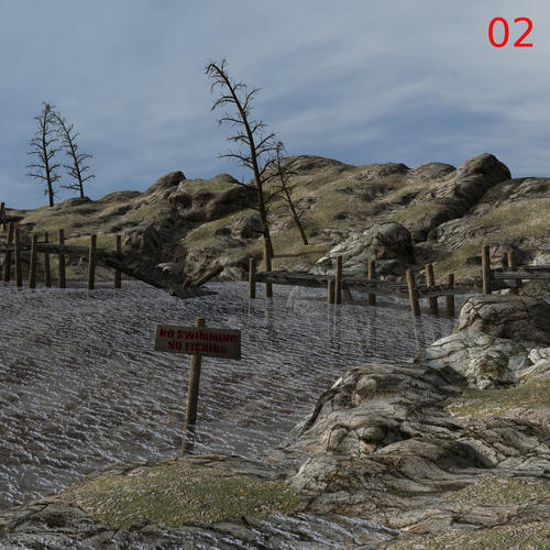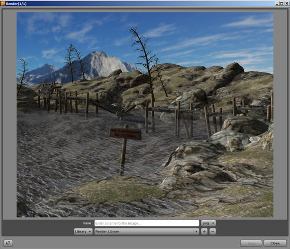 Let's have a test, nice idea! Pick the scene (smart content/presets/walkacrosswater), put some lights on it (realitysun will do, comes with the package), and let's render with the "footbridge3" camera (this is most likely the one used in thbe promo pic with the "no swimming" sign). Let's render it at 2000*2000pixel (highest quality) to check out the below average textures (especiall on the ground). Also let's put a skybox above the scene, to see if the water reflecting it or not.