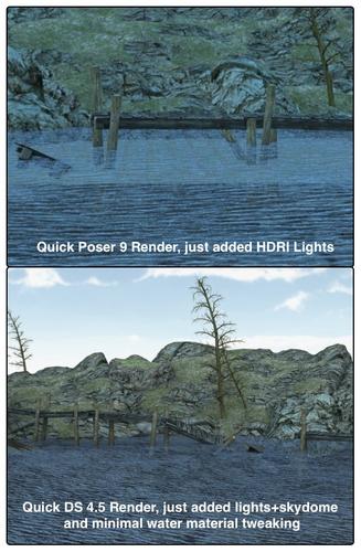 The Poser render is just to show that it does look a little different in Poser as the Poser render engine is a little different. If I've spend some hours of light tweaking it would look superb, or if I had used Luxus or Reality and a real water plane, or if I had imported it to Vue and rendered it there with physical water.