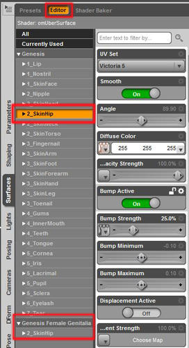 6) Paste the material onto the 2_SkinHip surface on the genital prop, which should also appear in the list.