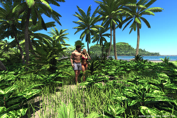 The other two renders are of an outdoor scenario called the Volcanic Archipelago. I have developed a light system not so different than Dreamlight has done, but my rig is for Bryce. It is called EGDLS (EarthGlow Dome Light Strategy). It makes difficult and complex scenes easy to illuminate and cover all of the bases with decent render times. DreamLight and I are more alike than different