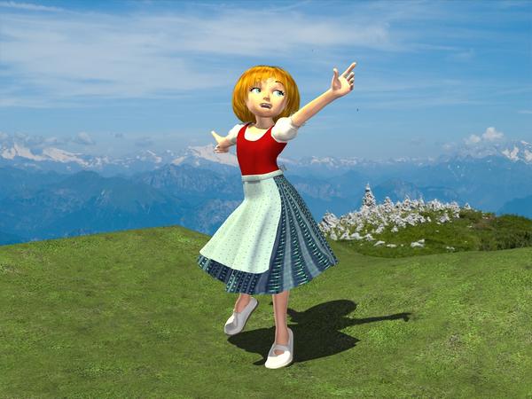 As I became more experienced, I began to work up my own outdoor light sets to save on memory load at render time (and increasingly frequent crashes as scenes became more involved). This came out of experimentation with the MPC as often time the "ground plane" would appear much darker in the render than the backdrop. Falling back on my theatrical experience, I developed both a five and seven source "daylight" setup using primarily distant lights, one for the sun and three to five for ambient effect with a point or spot light light for "fill" to soften harsh shadows on a characters face. The pic of Sadie (as Maria VonTrapp) below is probably my most successful. It employed a seven source setup with six distant lights and one spotlight. The setting used only ground plane prop and a photo backdrop.
