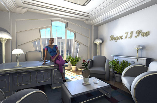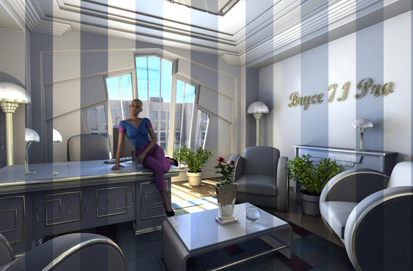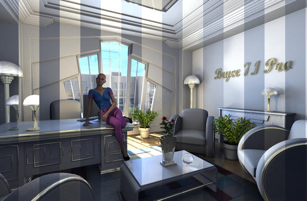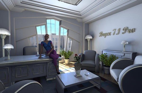 Version 2 sees the addition of an interior light source. Naturally, it is easier to view the items in the room when it is lit more intensely, this includes the Vicky character. Rather than to add a contrived halo of lights around the figure to the omission of everything else, I simply employed one of the available light props and lit the character as well as the scene. The key light from the lamp seems to strike her from a lower angle, which we know has certain psychological implications of its own. It also casts a nice silhouette on the far right wall. What I find is that the scene still retains a small degree of mystery even with this added light. Still Version 2 is most certainly happier seeming, less depressing at least compared to Version 1. It is a different mood altogether than Version 1.