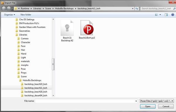 I have used some of HoboBo's .pz3 files though. You can unzip these "anywhere you like" - put mine in Runtime/Libraires/Scene/xxxx as shown in the attached screenshot. To use them in DAZ Studio, you need to do File->Import then navigate to wherever you've put them (you will need to pick "Poser files" in the dropdown filetype as shown in scereenshot 2) and import. DAZ Studio will then do its best with them. Note that HoboBo seems to hardcode a filename for the .jpg texture files which DS will be unable to find on your system - you just need to LOCATE and navigate to the same folder to shown DS where to look for them.