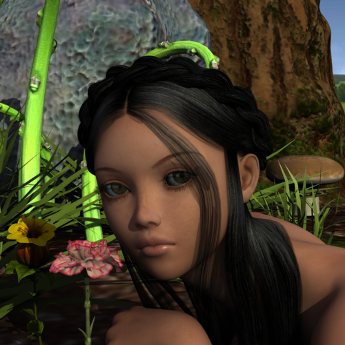 More experimentation. This time I lowered the subsurface scatter effect to make it more subtle and bring out the detail in her face. The original settings pretty much annihilated any imperfections and blemishes and gave a more toonish look to her. I think my tweaks came out rather nicely, but what are your thoughts?