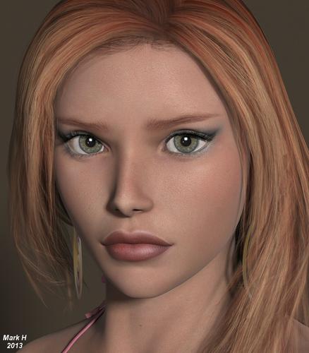 This portrait is a shameless attempt to reproduce the promo image of MDD Raquel, which was done in Poser using the Poser SSS material. I find it an instructive exercise to try to reproduce the lighting used by the pros. You learn a lot about the details of lighting that they use. The shadows are your guide to light placement and intensity. The key light I used was an InaneGlory beauty dish camera right and above. This was placed fairly far from the model to match the hardness of the shadows. The fill light was an InaneGlory softbox camera left. The render was at gamma 2.2 with gamma correction. The fill intensity was about 1/16th the key.