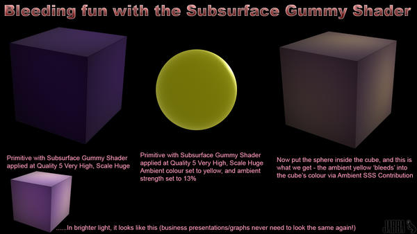 Here's gummy bleed applied to a scene (sphere inserted into Genesis chest as per example with primitives above)...