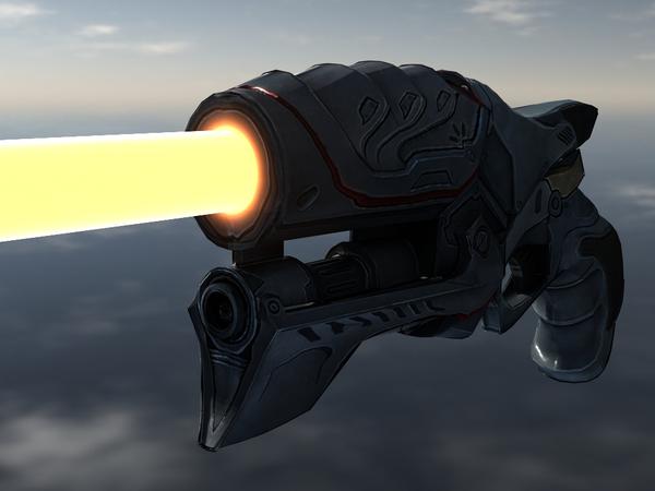 Next created a primitive cylinder, scales & aligned it with the Laser Pistol Barrel, used the Orange Gummy Shader on it and then adjusted the settings a bit to get the glow & bleed into the gun.