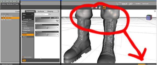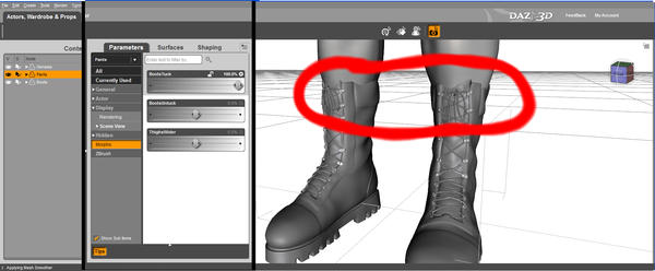 It seems the "boot tuck" morph isn't working correctly. The pants morph correctly while the morph is loading, but reverts back to original shape when the morph is loaded completely.