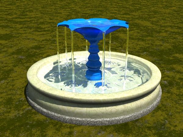 As far as the blue of the fountain, maybe there is two much ambient light in the scene and that is washing it out?