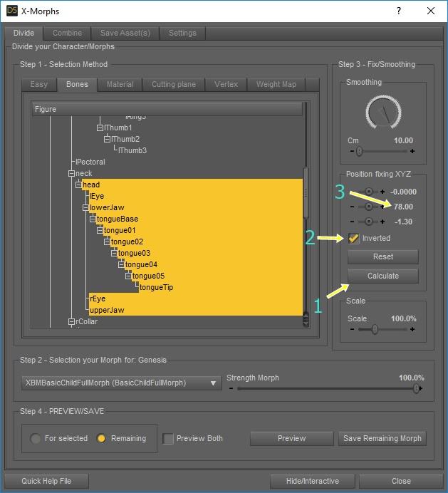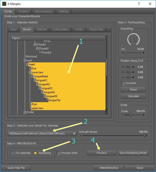 3.- In Divide-Bones, Select "Head" (childs), select "BasicChildFullMorph", select "Remaining", and Click "Preview"