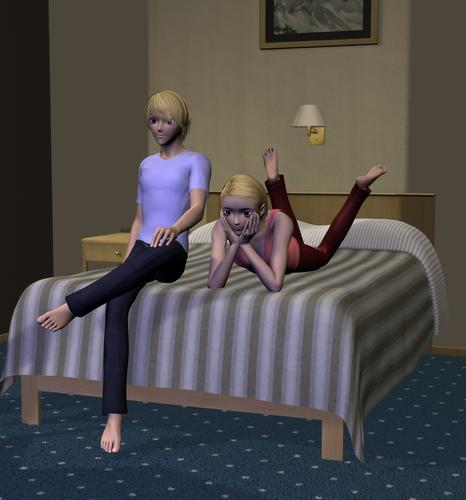 As I explained, these are my two signature characters, a pair of anime twins named Stephan & Stephanie made with Genesis. Here they are depicted watching a TV documentary of 3D computer development while on vacation, much to Stephan's interest, not so much to Stephanie's.