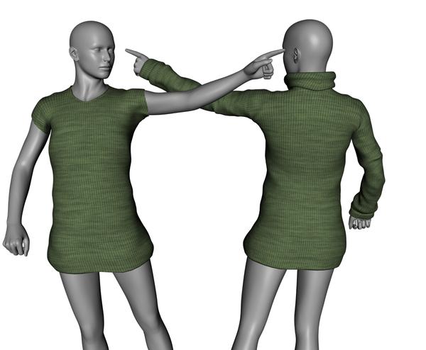 To illustrate the point about material zones, here is the same sweater - with all material zones visible (right) and neck and sleeves set to invisible (left). If you want some other invisibility, say, to cut a tear in the sweater or shorter/longer sleeves, you'd have to make black and white opacity map.